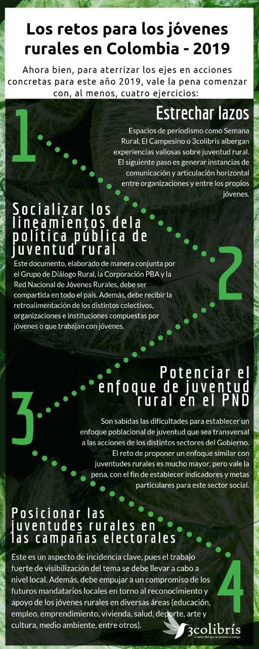 - Estrechar lazos entre las distintas organizaciones e instituciones juveniles rurales o que trabajan con jóvenes que viven en el campo. Espacios de periodismo como Semana Rural, El Campesino o 3colibris albergan experiencias valiosas sobre juventud rural. El siguiente paso es generar instancias de comunicación y articulación horizontal entre organizaciones y entre los propios jóvenes.
