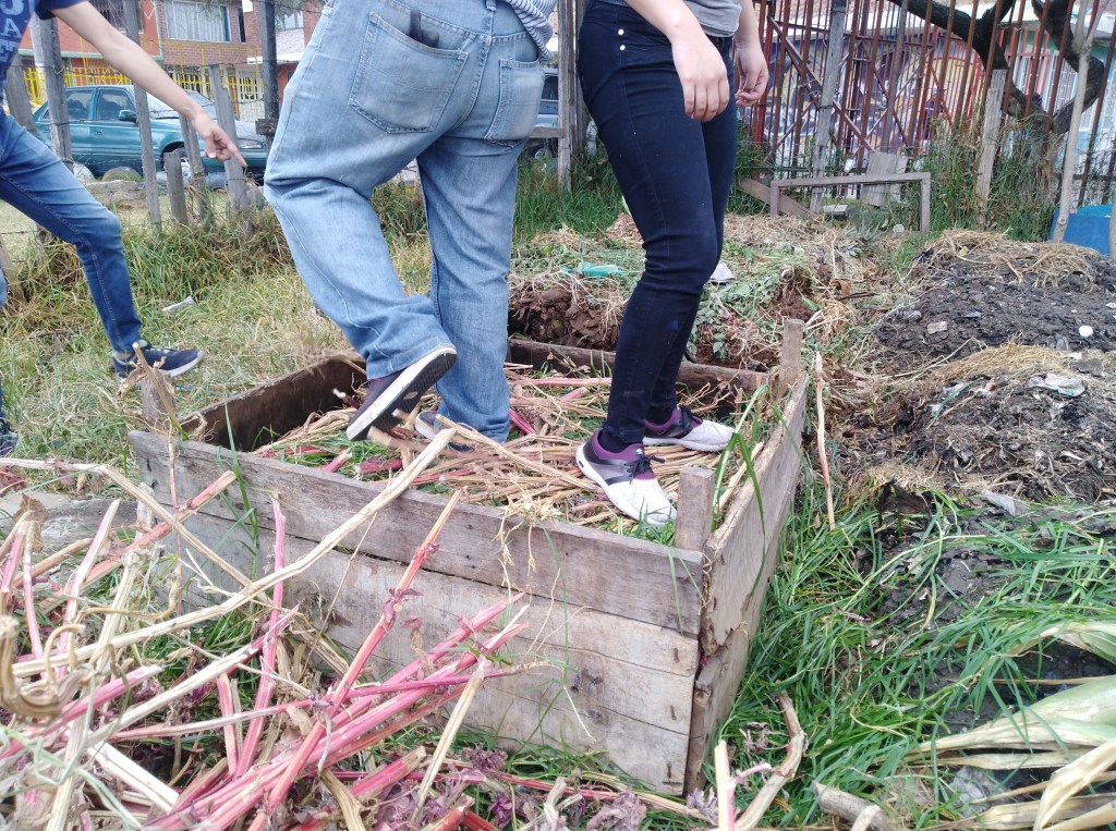 Allí fue donde conocí a Don Saulo, uno de sus asociados, afortunadamente me recibió con trabajo. A mí y a un grupo de personas que visitaban también esta experiencia. Empezamos muy pronto a descubrir el espacio un poco bajo la intuición un poco bajo lo que la tarea implicaba. Pues había que armar una paca de compostaje, bailar sobre ella, y cerrarla, no como una lasaña sino como una papa rellena. Tan forrada como fuese posible para evitar animales no tan favorables a esta, como los ratones o las moscas.