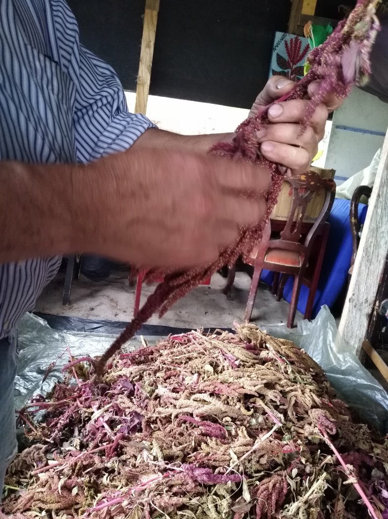 Aquí, lo uno los trabajos se hacen de acuerdo con las prioridades que haya. Hay algunos trabajos que hay que hacer. Ahora mismo la prioridad es la recolección de amaranto. Por lo menos ahí está Fernando, él está interesado en embellecer la parte de allá, va a hacer un mural. A él le gusta trabajar esas cosas. No le gusta meterse con el amaranto, que, porque le salen arañas y él le tiene pánico a las arañas, y se le suben; entonces prefiere hacer otros trabajos.